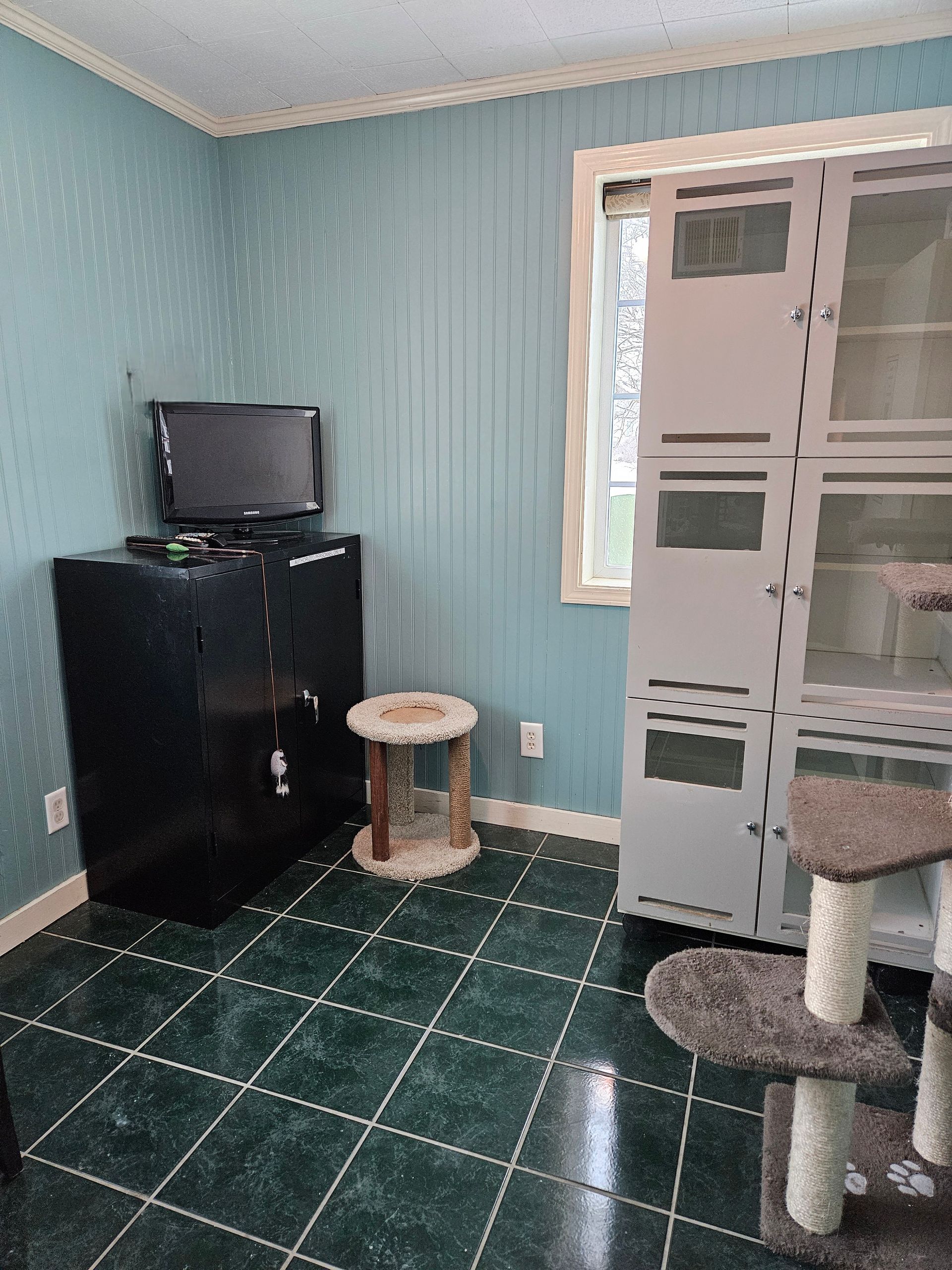 Each room has a bed, fresh bedding, water and food dishes, a TV, and personal lighting. There is individual heating and cooling in all the suites to keep our guests comfortable every day. Our rooms each have a private indoor patio. Each pet is taken outdoors several times daily for potty and play.